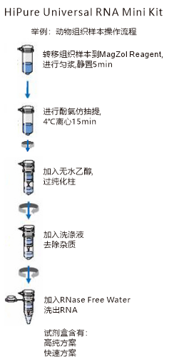 | HiPure Unviersal RNA Kits將經(jīng)典的一步法RNA抽提試劑和硅膠柱純化方式相結(jié)合,可大大提高RNA的純度和樣品的廣泛性。純化RNA可直接用于RT-PCR,芯片分析,第二代測(cè)序,cDNA文庫構(gòu)建等運(yùn)用。組織/細(xì)胞樣品經(jīng)一步法RNA抽提試劑(MagZol Reagent)勻漿,加入氯仿抽提去除基因組DNA和蛋白質(zhì),得到的上清液與乙醇混勻后,轉(zhuǎn)移至RNA柱子中進(jìn)一步純化RNA,經(jīng)洗滌液去除雜質(zhì)和鹽分,最后用DEPC水洗脫出高純度的RNA。HiPure Unviersal RNA Mini Kit適合于從小于100mg動(dòng)物組織,植物組織,真菌樣品,細(xì)菌,細(xì)胞等樣品中提取高達(dá)200ug的總RNA。 |