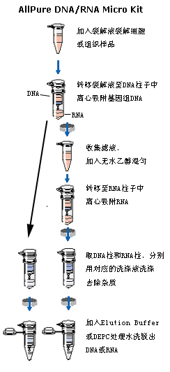 | 本試劑盒采用玻纖濾膜純化技術(shù),只需進行簡單的結(jié)合-洗滌-洗脫的步驟。樣本在含胍鹽的裂解液進行破碎和勻漿,裂解物轉(zhuǎn)移至DNA過濾柱離心,則DNA被高效吸附至DNA柱子中,收集含RNA的濾液,加入乙醇以提供合適的結(jié)合條件,并轉(zhuǎn)移至純化柱中并離心,高達100μg的RNA可被選擇性結(jié)合到膜上,污染物經(jīng)三次清洗被高效洗去,最后純化RNA被RNase Free Water洗脫出來,最后純化DNA被Elution Buffer洗脫出來。 | |
