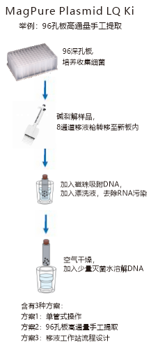 本試劑盒采用磁珠純化技術(shù),適合于從1-3ml培養(yǎng)液中提取高達(dá)20ug的質(zhì)粒DNA。得到的質(zhì)粒DNA可用測(cè)序、酶切、連接,克隆,PCR等應(yīng)用。提取過(guò)程無(wú)需接觸有毒酚氯仿有機(jī)物抽提,也需要用到耗時(shí)的離心步驟。高通量提取操作可以通過(guò)96孔磁力架和96振蕩儀實(shí)現(xiàn),可以核酸提取儀上(如KingFisherFle, MagMix32, MagMix 96)進(jìn)行高通量提取,還可以配合移液工作站(Hamilton, Tican)進(jìn)行自動(dòng)化提取。整個(gè)提取可以在20分鐘內(nèi)完成。 |