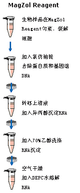 | MagZol Reagent為單一相的溶液,含有異硫氰酸胍和酸性酚。該試劑是一步法酸性酚異硫氰酸胍RNA提取方案的改良而成(Piort Chemczychi, 1987)。MagZol Reagent可快速裂解細胞/組織,讓RNA釋放至溶液中,以此同時,試劑中含有的異硫氰酸胍和酚可快速失活各種核酸酶,保護RNA不發(fā)生降解。經(jīng)過氯仿抽提后形成三相體系,其中RNA分布于水相層,DNA和蛋白質(zhì)分布中間層和有機層,達到分離RNA的目的。MagZol Reagent適合于從各種生物樣品中快速提取總RNA。使用該方法純化的RNA可直接用于RT-PCR、Northern雜交、Poly(A)富集等下游應(yīng)用。此外,該試劑還可以用于DNA和蛋白質(zhì)。 生物樣品在MagZol Reagent中勻漿裂解后,室溫保存一天,2-8℃保存一周,-20℃或-80℃長期保存。 |