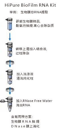| 50-100mg研磨樣本粉末至特殊裂解液中裂解,在進(jìn)行氯仿抽提,離心得到澄清的上清,加入結(jié)合液在玻璃纖維柱膜上結(jié)合核酸,(根據(jù)需求可以進(jìn)行膜上酶消化,得到純度更高的核酸)在進(jìn)行清洗,最后通過(guò)少量水洗出RNA。 |