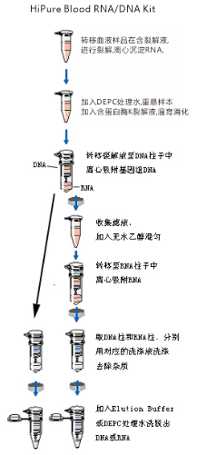 | 本試劑盒采用玻纖濾膜純化技術(shù),只需進(jìn)行簡(jiǎn)單的結(jié)合-洗滌-洗脫的步驟。樣本在含胍鹽的裂解液進(jìn)行破碎和勻漿,裂解物轉(zhuǎn)移至DNA過(guò)濾柱離心,則DNA被高效吸附至DNA柱子中,收集含RNA的濾液,加入乙醇以提供合適的結(jié)合條件,并轉(zhuǎn)移至純化柱中并離心,高達(dá)100μg的RNA可被選擇性結(jié)合到膜上,污染物經(jīng)三次清洗被高效洗去,最后純化RNA被RNase Free Water洗脫出來(lái),最后純化DNA被Elution Buffer洗脫出來(lái)。 | |