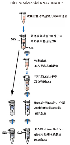 | 本試劑盒采用玻纖濾膜純化技術(shù),只需進(jìn)行簡單的結(jié)合-洗滌-洗脫的步驟。樣本在含胍鹽的裂解液和玻璃珠的管內(nèi)進(jìn)行破碎和勻漿,裂解物轉(zhuǎn)移至DNA過濾柱離心,則DNA被高效吸附至DNA柱子中,收集含RNA的濾液,加入乙醇以提供合適的結(jié)合條件,并轉(zhuǎn)移至純化柱中并離心,高達(dá)100μg的RNA可被選擇性結(jié)合到膜上,污染物經(jīng)三次清洗被高效洗去,最后純化RNA被RNase Free Water洗脫出來,最后純化DNA被Elution Buffer洗脫出來。 | |