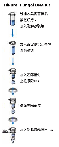 本試劑盒采用玻纖濾膜純化技術(shù),只需進(jìn)行簡單的結(jié)合-洗滌-洗脫的步驟。真菌經(jīng)離心收集后,經(jīng)溶菌酶消化去除細(xì)胞壁,再經(jīng)過裂解液和蛋白酶K裂解消化,DNA從胞內(nèi)釋放出來,加入結(jié)合液調(diào)整最佳的結(jié)合條件后轉(zhuǎn)移至純化柱中并離心,DNA被選擇性地結(jié)合到濾膜,而蛋白質(zhì)等雜質(zhì)由濾出到濾液中。經(jīng)過兩個洗滌步驟除去了殘留的污染物和酶抑制劑,最后DNA被少量的水或緩沖液洗脫出來。 |