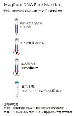 | 適合于從各種濃度的瓊脂糖凝膠中回收50bp-20Kbp DNA片段。此外,該試劑盒也適合于從PCR產(chǎn)物中,酶促反應(yīng)液中,或由各種方法獲得的粗制的DNA(包括基因組DNA)中回收純化DNA。凝膠在溶膠液作用下溶解,DNA釋放到溶膠液中。加入磁性粒子吸附DNA,而溶解的瓊脂糖則不被吸附而去除。吸附了DNA的粒子經(jīng)洗滌液洗滌去除瓊脂糖和其它雜質(zhì),再經(jīng)含乙醇洗滌去除鹽分,最后DNA被低鹽緩沖液(Elution Buffer)洗脫。洗脫的DNA可直接用于PCR、二代測序、芯片分析等實(shí)驗(yàn)。 |